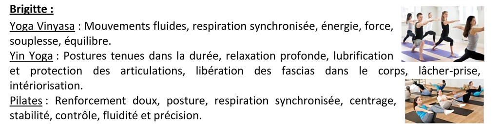 Brigitte propose également des séances de Yin Yoga, axées sur la détente et l’étirement profond, ainsi que du Vinyasa Yoga, fluide et tonique, qui mobilise le souffle et le mouvement dans un bel équilibre.