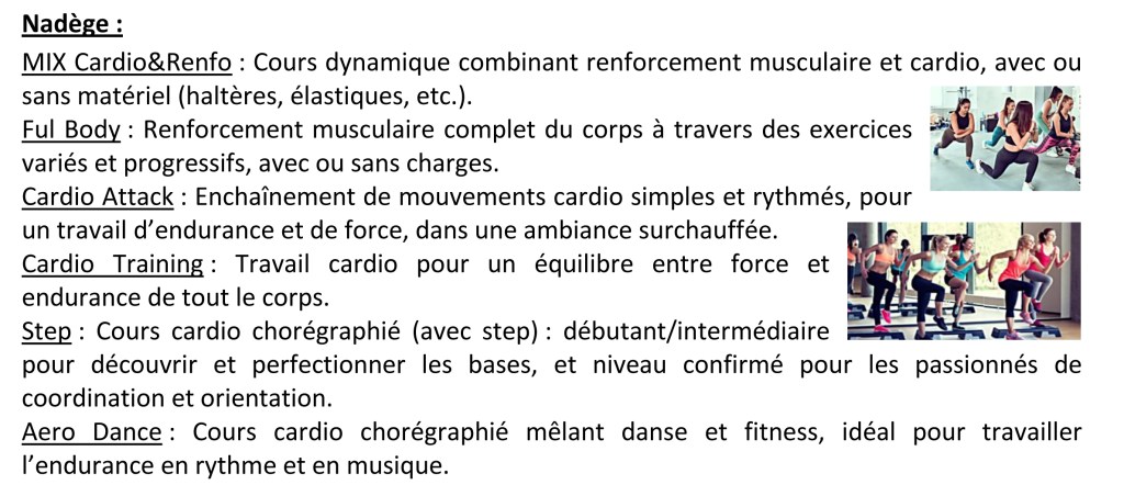 D’abord, le Body Mix, un cours surprise qui change chaque semaine selon l’inspiration du moment : cardio, renfo, avec ou sans matériel, avec ou sans step… l’idée, c’est de varier les plaisirs et les intensités, toujours dans la bonne humeur.