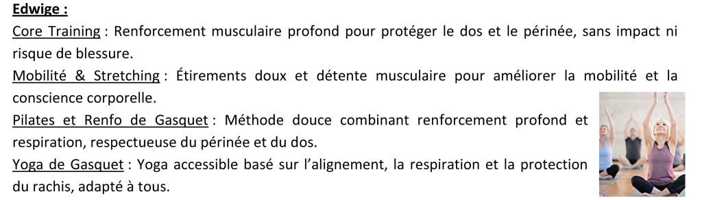 Avec bienveillance, passion et précision, Edwige vous guide dans des cours pensés pour le bien-être du corps et de l’esprit. Elle propose du Pilates, du Yoga De Gasquet tout en douceur et en respiration, du Stretching / conscience corporelle pour relâcher les tensions, ainsi que du Core training – Renfo sans dégâts, un renforcement profond et respectueux du dos et du périnée.